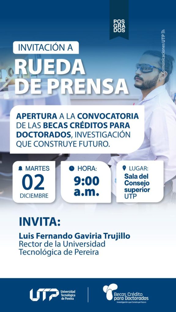 Te invitamos a la Rueda de Prensa donde presentaremos oficialmente la Convocatoria de Becas Crédito para Doctorados, un programa que impulsa el talento científico y fortalece el futuro de la región.
