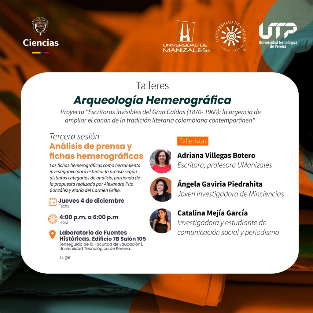 Los talleres se ofrecen como parte de las actividades del proyecto «Escritoras invisibles del Gran Caldas (1870- 1960): la urgencia de ampliar el canon de la tradición literaria colombiana contemporánea», apoyado por MinCiencias, la Universidad Tecnológica de Pereira, la Universidad de Manizales y la Universidad de Caldas.