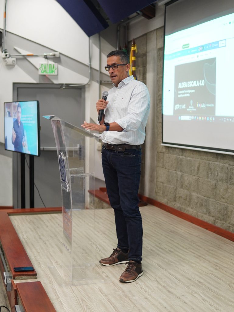 El evento avanzó con la intervención de Juan Esteban Tibaquirá, director del programa Aldea Escala 4.0, quien presentó los resultados del acompañamiento realizado a las 18 empresas beneficiarias. Durante su presentación, enfatizó en el fortalecimiento de capacidades digitales, la adopción de soluciones tecnológicas y las proyecciones de escalamiento que permitirán consolidar procesos de innovación sostenibles.