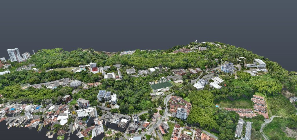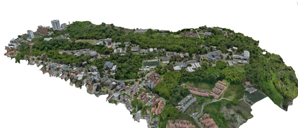 El proyecto inició con un levantamiento fotogramétrico (fotos con dron, para el trabajo topográfico), que siguió las especificaciones técnicas del IGAC. Además, se instalaron mojones georreferenciados mediante tecnología RTK-GNSS, lo que permitió alcanzar una precisión milimétrica tanto en este levantamiento como en la referencia de levantamientos posteriores. Este proceso se realizó no solo en el campus central, sino también en todas sus sedes alternas, lo que permitió construir una base cartográfica sólida sobre la cual se referenció toda la información geoespacial.