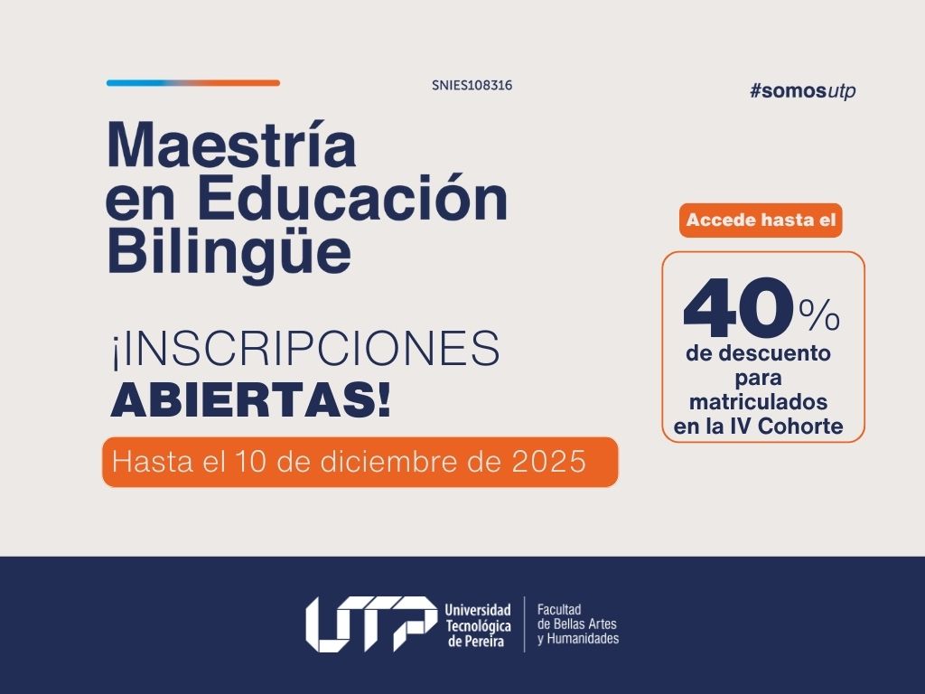 La Universidad Tecnológica de Pereira invita a docentes y profesionales apasionados por la diversidad cultural y lingüística a postularse a la Maestría en Educación Bilingüe, un programa que busca transformar los procesos de enseñanza y aprendizaje en el país.