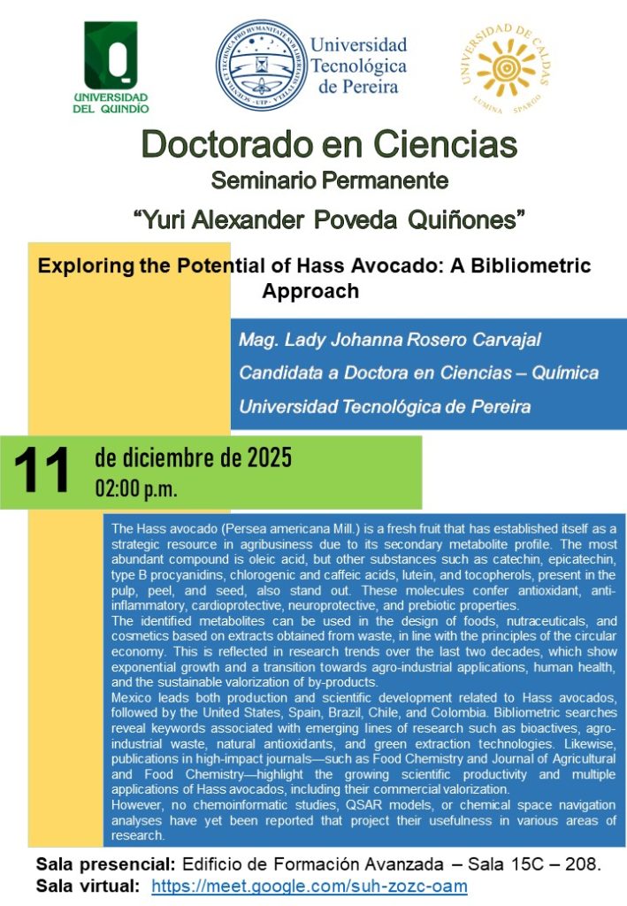 Desde el Doctorado de Ciencias de la Universidad Tecnológica de Pereira, se comparte la invitación al Seminario Permanente «Yuri Alexander Poveda Quiñones». Durante el mismo, la estudiante Lady Johanna Rosero Carvajal realizará la presentación de su «Seminario de Investigación II», el cual se titula «Exploring the Potential of Hass Avocado: A Bibliometric Approach».
