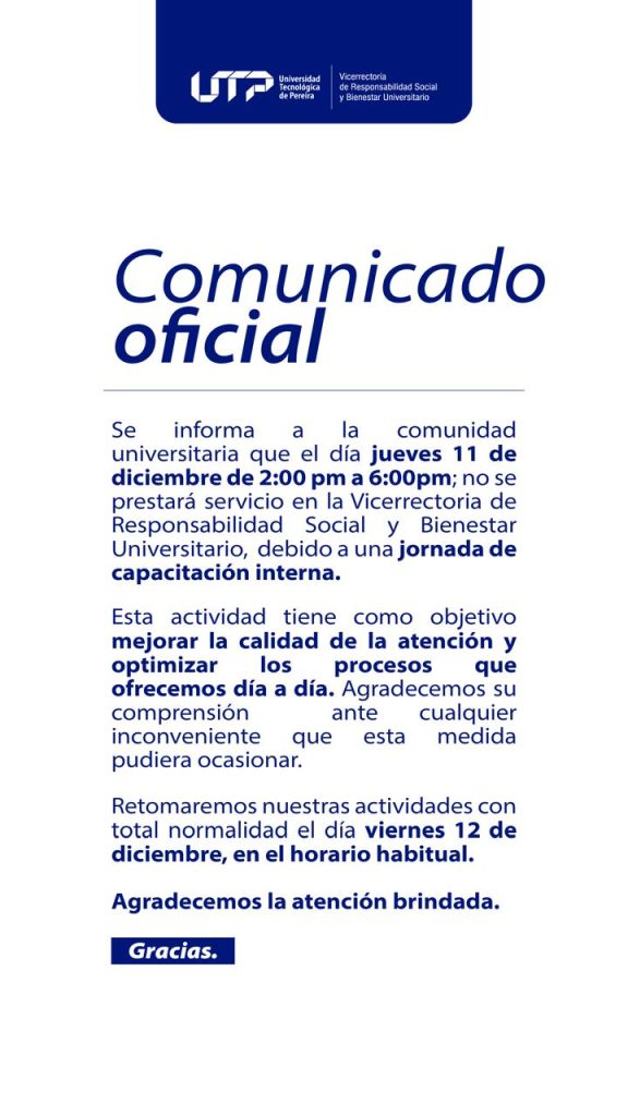 Se informa a la comunidad universitaria que el día jueves 11 de diciembre, de -2:00 p. m. a 6:00 p. m.- no se prestará servicio en la Vicerrectoría de Responsabilidad Social y Bienestar Universitario, debido a una jornada de capacitación interna.