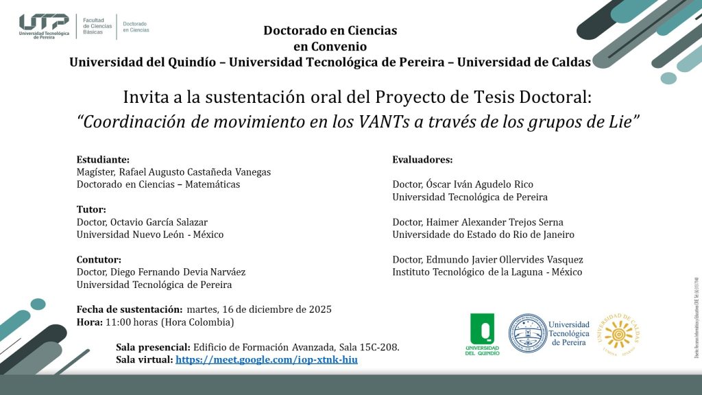 «Coordinación de movimiento en los VANTs a través de los grupos de Lie» presentado por el estudiante Rafael Augusto Castañeda Vanegas, orientado por el Doctor Octavio García Salazar de la