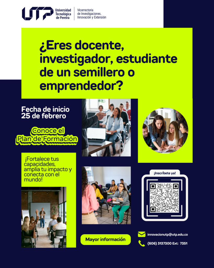 Desde la Vicerrectoría de Investigaciones, Innovación y Extensión de la Universidad Tecnológica de Pereira invitamos cordialmente a los docentes, investigadores, estudiantes de semilleros de investigación y emprendedores UTP a ser parte del Plan de Formación: Competencias Investigativas para la Innovación y la Transferencia de Conoc, una iniciativa que busca fortalecer las capacidades de nuestra comunidad académica para conectar la ciencia con las necesidades del entorno y convertir el conocimiento en soluciones.