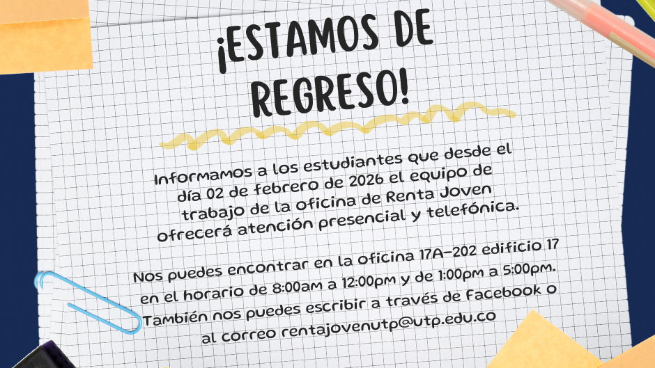 La oficina de Renta Joven de la Universidad Tecnológica de Pereira informa a los estudiantes que desde el día 02 de febrero de 2026 el equipo de trabajo de la oficina de Renta Joven ofrecerá atención presencial y telefónica.