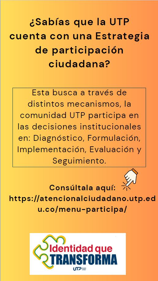 La Universidad Tecnológica de Pereira cuenta con una Estrategia de Participación Ciudadana que promueve el diálogo, la transparencia y la toma de decisiones compartidas con la comunidad universitaria y la ciudadanía en general.