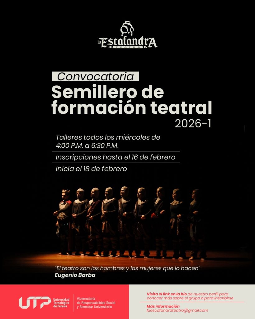 El Grupo de Teatro Escafandra invita a la comunidad universitaria a ser parte de su nueva convocatoria, abierta hasta el próximo 16 de febrero, para todas las personas interesadas en explorar el teatro como un espacio de creación, expresión y trabajo colectivo.