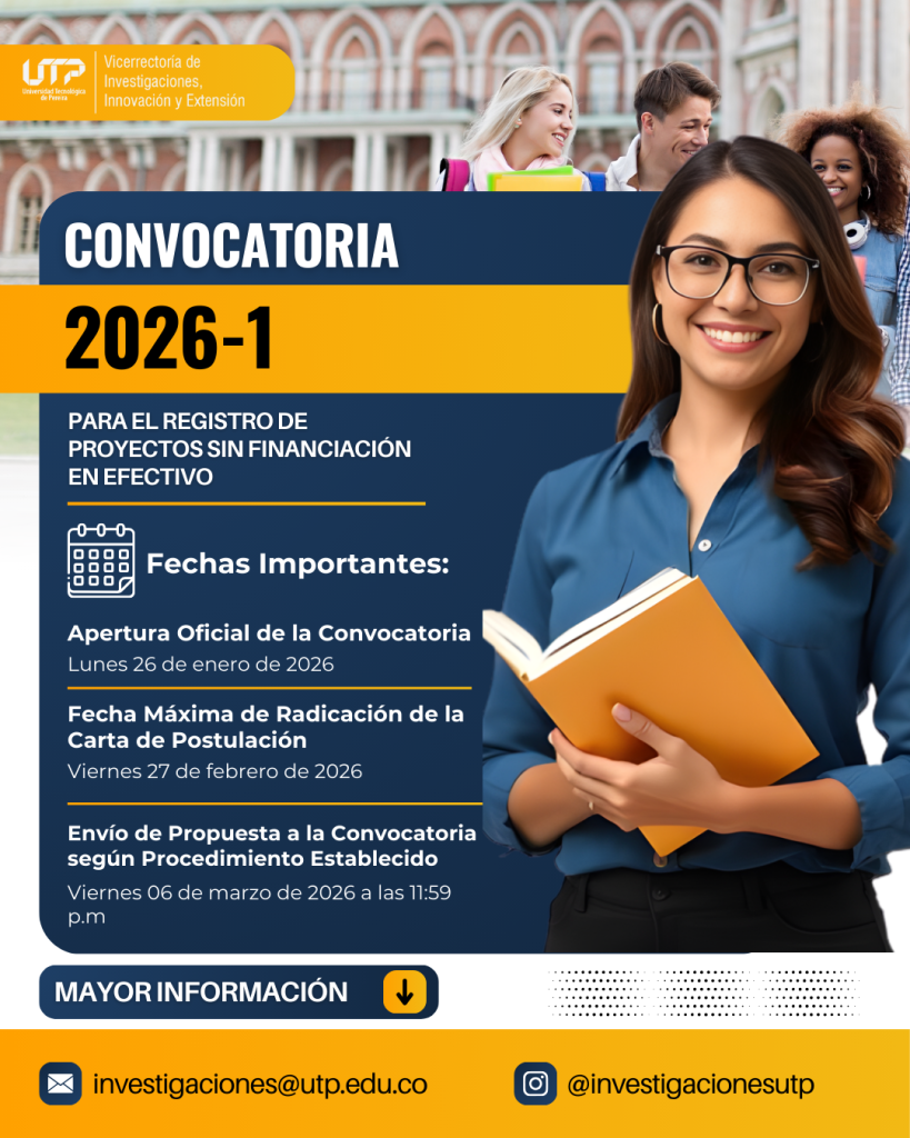 La Universidad Tecnológica de Pereira, a través de la Vicerrectoría de Investigaciones, Innovación y Extensión, informa que ya se encuentra abierta la Convocatoria para el Registro de Proyectos sin Financiación en Efectivo – Año 2026-1, dirigida a fortalecer la actividad investigativa institucional y a promover la generación de conocimiento en las distintas áreas del saber.