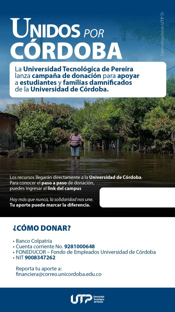 La Universidad Tecnológica de Pereira se suma a la campaña de solidaridad que varias universidades pertenecientes al Sistema Universitario Estatal (SUE) desarrollarán para apoyar a la mayoría de la comunidad universitaria y sus familias de la Universidad de Córdoba que se han visto gravemente afectadas por las recientes inundaciones y las difíciles condiciones climatológicas que han golpeado al departamento de Córdoba en los últimos meses.