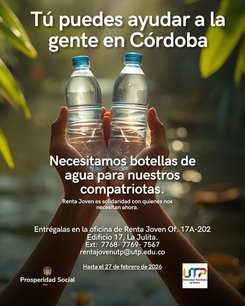 La oficina de Renta Joven de la Universidad Tecnológica de Pereira informa que ante la difícil situación que actualmente enfrentan muchas familias del departamento de Córdoba debido a las recientes emergencias, la gerencia regional de Prosperidad Social en Risaralda, hace un llamado a la solidaridad y al compromiso social que nos caracteriza como comunidad.