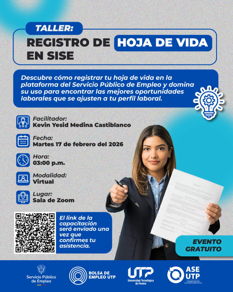 La Asociación de Egresados de la Universidad Tecnológica de Pereira (ASEUTP) los invita a participar en un ciclo de 4 talleres gratuitos diseñados para fortalecer la empleabilidad y el liderazgo en el mercado laboral actual.