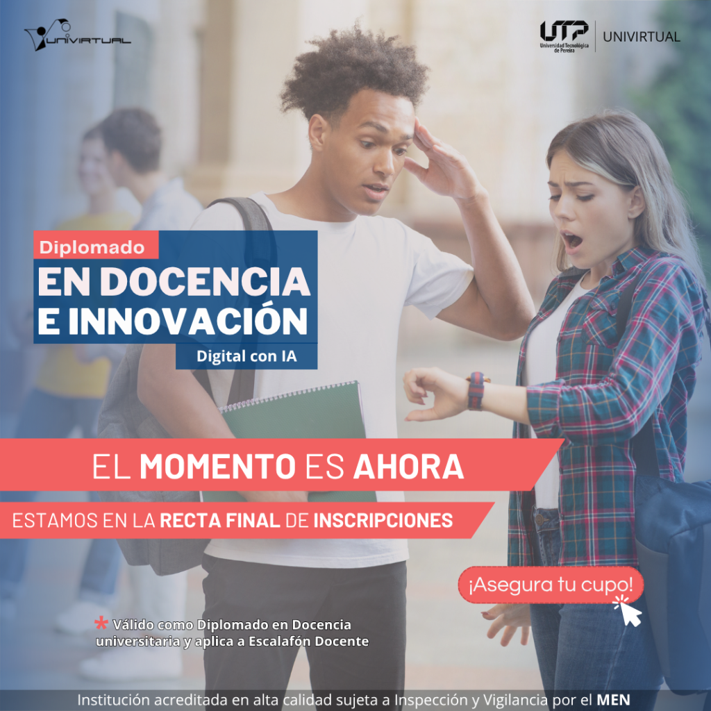Quedan pocos días para dar el paso hacia una docencia renovada. Así podría resumirse el momento que hoy viven los docentes y profesionales interesados en ser parte del Diplomado en Docencia e Innovación Digital con IA de la Universidad Tecnológica de Pereira.