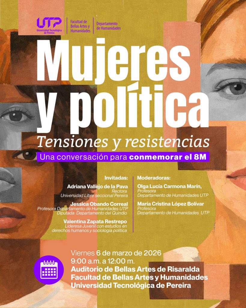 En el marco del Día Internacional de los Derechos de las Mujeres, el Departamento de Humanidades de la Facultad de Bellas Artes y Humanidades de la Universidad Tecnológica de Pereira invita a la comunidad desde ya a agendarse para una jornada de reflexión necesaria sobre el papel de la mujer en la democracia. Bajo el título «Mujeres y política: tensiones y resistencias», este encuentro busca visibilizar las luchas históricas y los retos actuales para alcanzar la paridad de género en el país.
