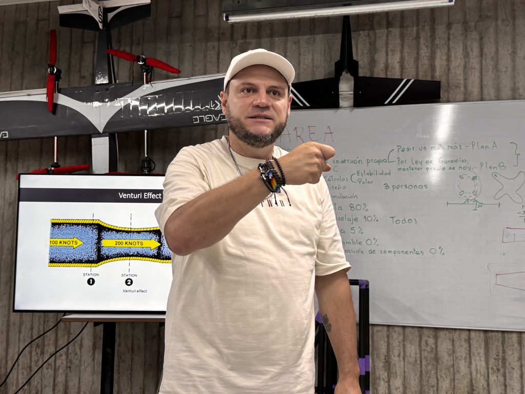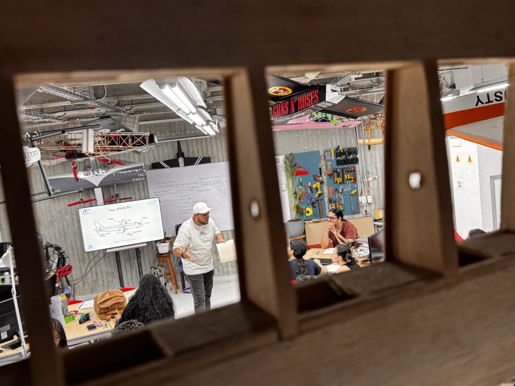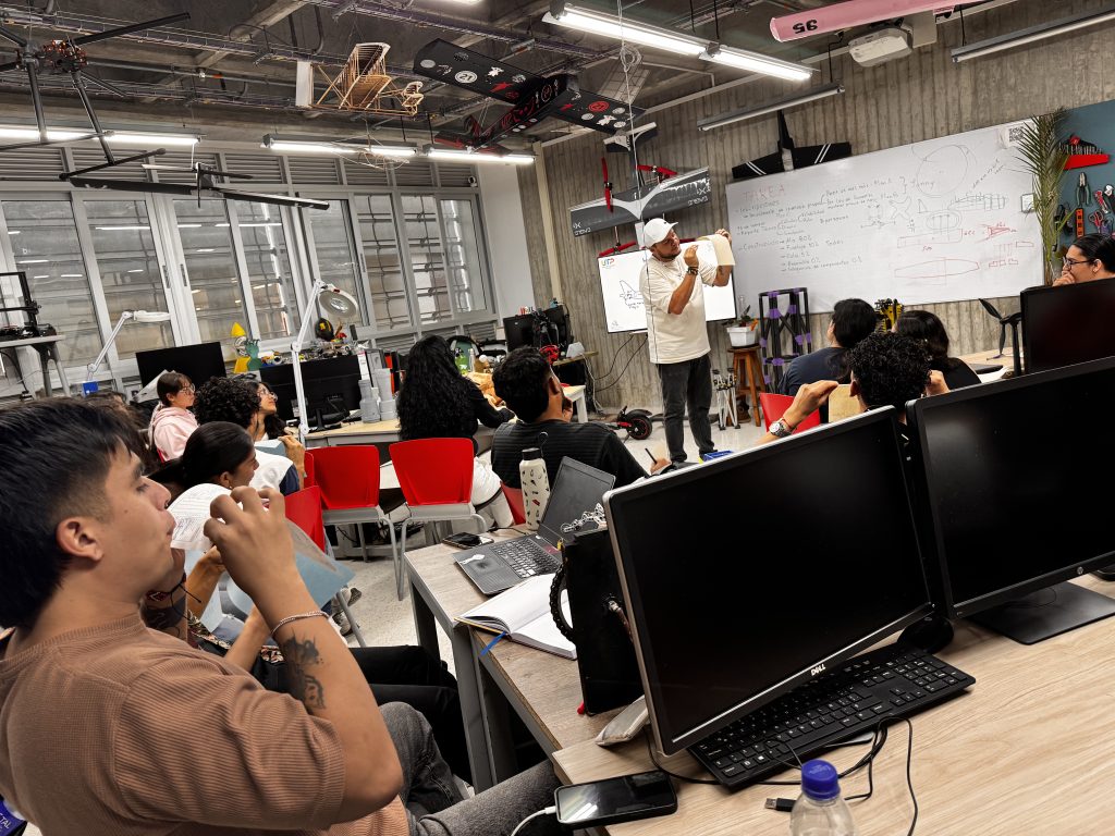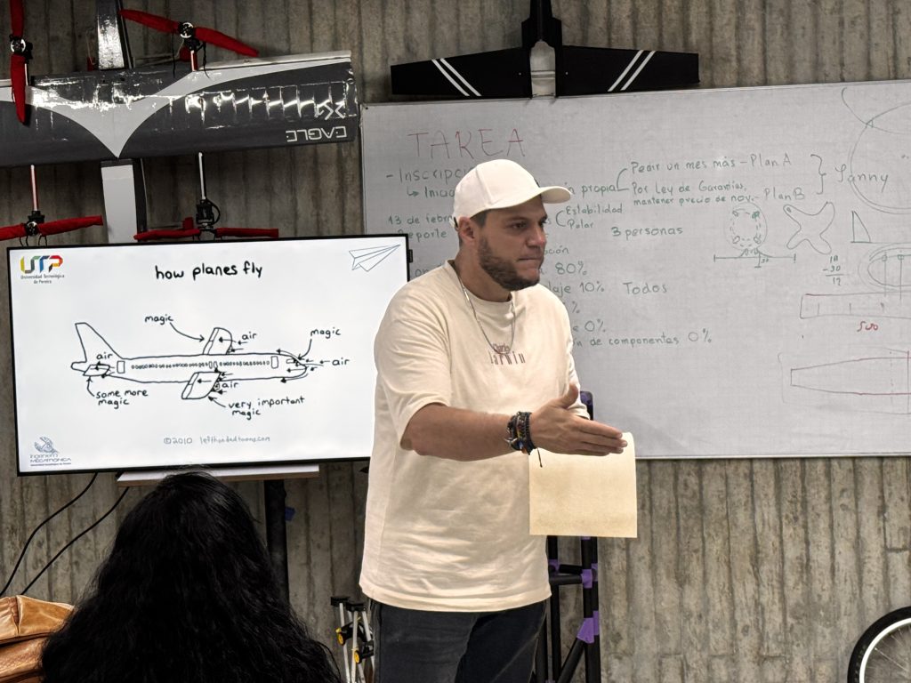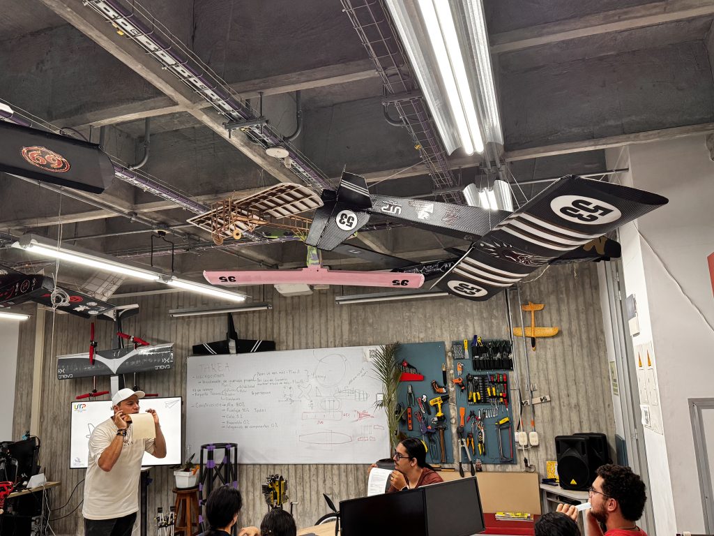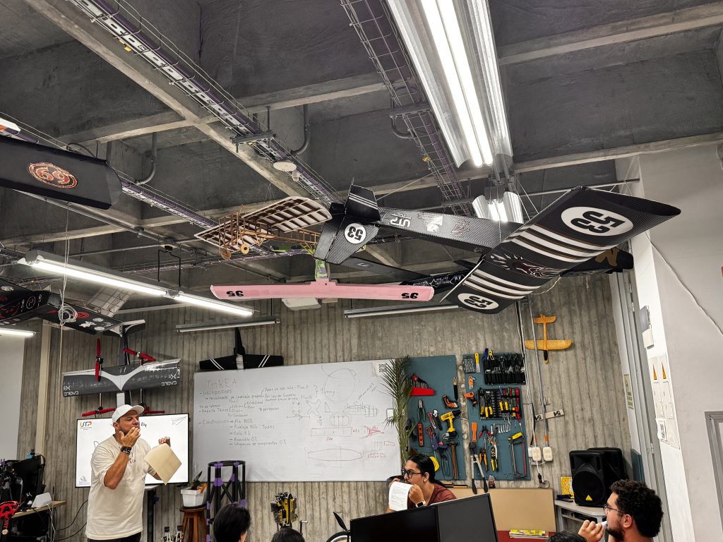 Cada avión colgado es más que una maqueta: es el resultado de horas de trabajo colaborativo entre estudiantes de Ingeniería Mecánica, Mecatrónica, Física y otras disciplinas. Él orienta, pero son ellos quienes diseñan, calculan, imprimen, ensamblan y prueban.