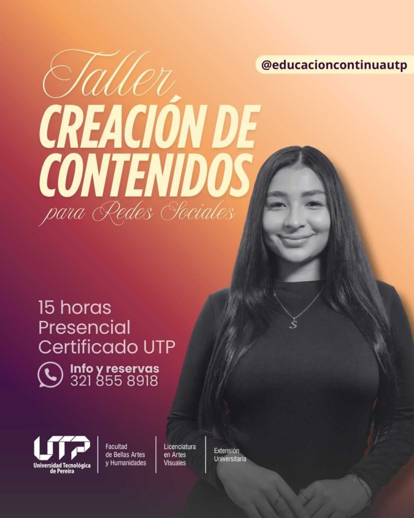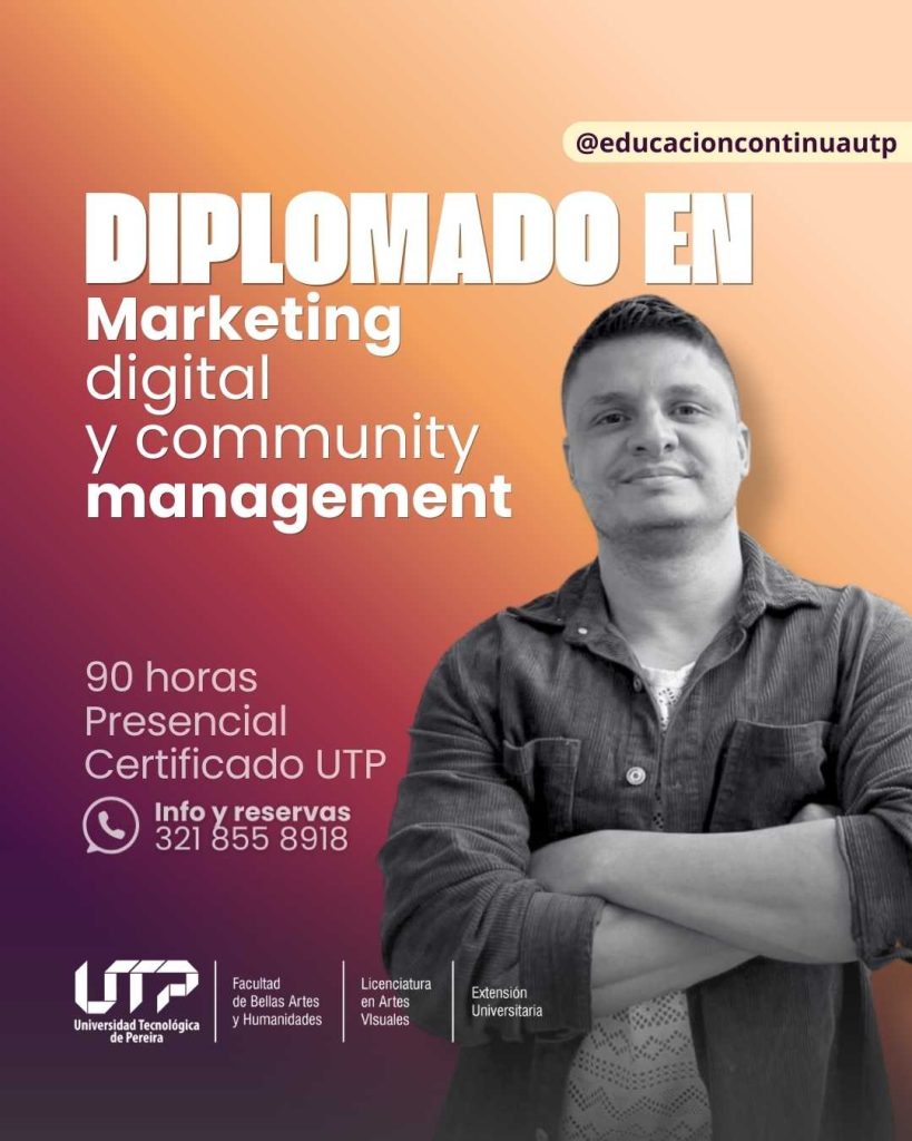 La Facultad de Bellas Artes y Humanidades de la Universidad Tecnológica de Pereira, a través de sus programas de extensión, invita a la comunidad universitaria y al público en general a participar en su oferta de formación en marketing digital, gestión de redes sociales y creación de contenidos, programas diseñados para fortalecer habilidades en comunicación digital, posicionamiento de marca y desarrollo de estrategias en entornos digitales.