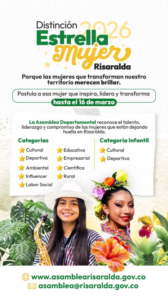 La Asamblea Departamental de Risaralda abrió la convocatoria para la distinción “Estrella Mujer Risaralda 2026”, un reconocimiento creado mediante la Ordenanza 005 de 2021 que busca exaltar el liderazgo, la trayectoria y el impacto social de mujeres que contribuyen al desarrollo del departamento.