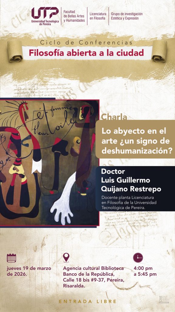 El programa de la Licenciatura en Filosofía de la UTP y el grupo de investigación en Estética y Expresión, invitan al ciclo de Conferencias «Filosofía abierta a la Ciudad», con la charla “Lo abyecto en el arte ¿un signo de deshumanización?” a cargo del doctor Luis Guillermo Quijano Restrepo, docente planta Licenciatura en Filosofía de la Universidad tecnológica de Pereira.