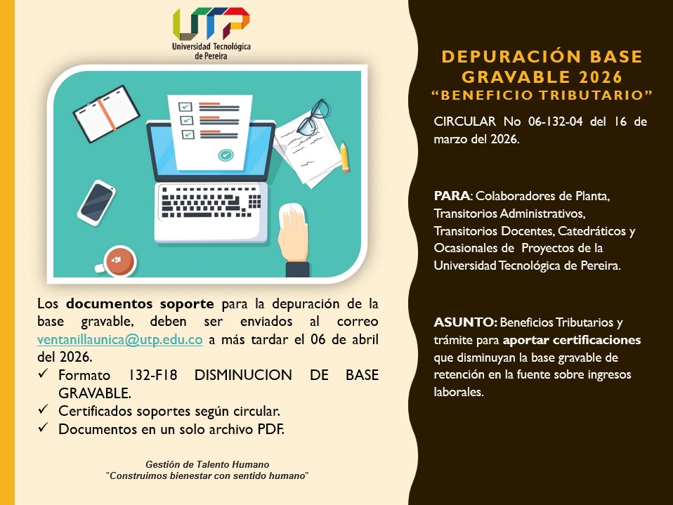 De acuerdo con lo estipulado en el Estatuto Tributario, atentamente se informa que los documentos soportes para la depuración de la base gravable, deben ser enviados al correo ventanillaunica@utp.edu.co, a más tardar el 06 de abril de 2026, según cada caso en particular: