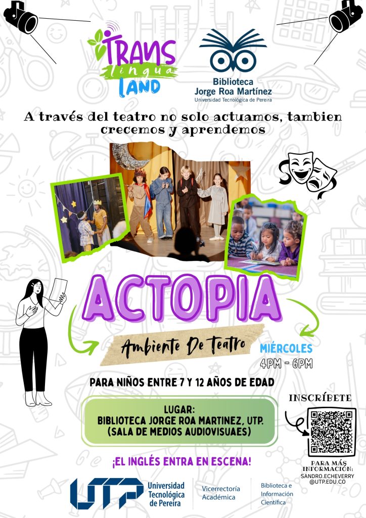 Actopía (Taller de teatro) Enfocado en la expresión corporal y oral para niños de 7 a 12 años. Horario: miércoles de 4:00 p. m. a 6:00 p. m.