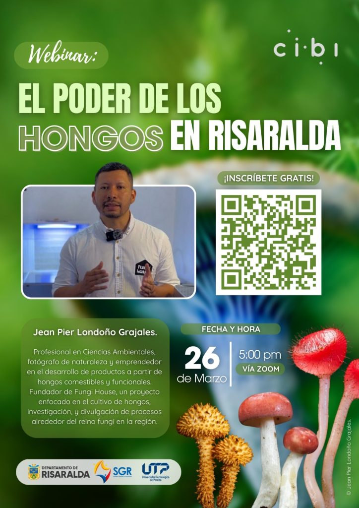 El Centro de Ciencia en Biodiversidad de Risaralda realizará el webinar “El poder de los hongos en Risaralda”, un espacio virtual que busca acercar al público al conocimiento del reino fungi y su importancia en los ecosistemas del departamento. El evento contará con la participación del investigador Jean Pier Londoño Grajales y se llevará a cabo el jueves 26 de marzo a las 5:00 p. m. a través de Zoom.