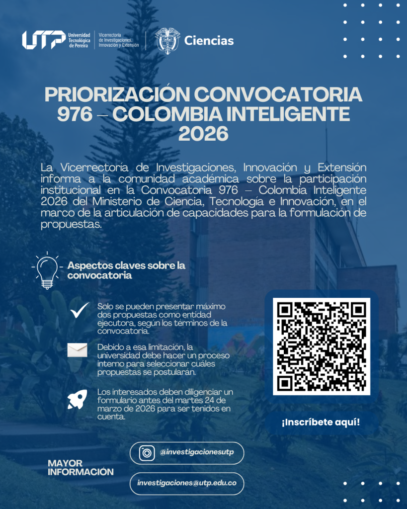 La Vicerrectoría de Investigaciones, Innovación y Extensión, informa a la comunidad académica sobre la participación institucional en la Convocatoria 976 – ColombIA Inteligente 2026 del Ministerio de Ciencia, Tecnología e Innovación, en el marco de la articulación de capacidades para la formulación de propuestas (Ver)