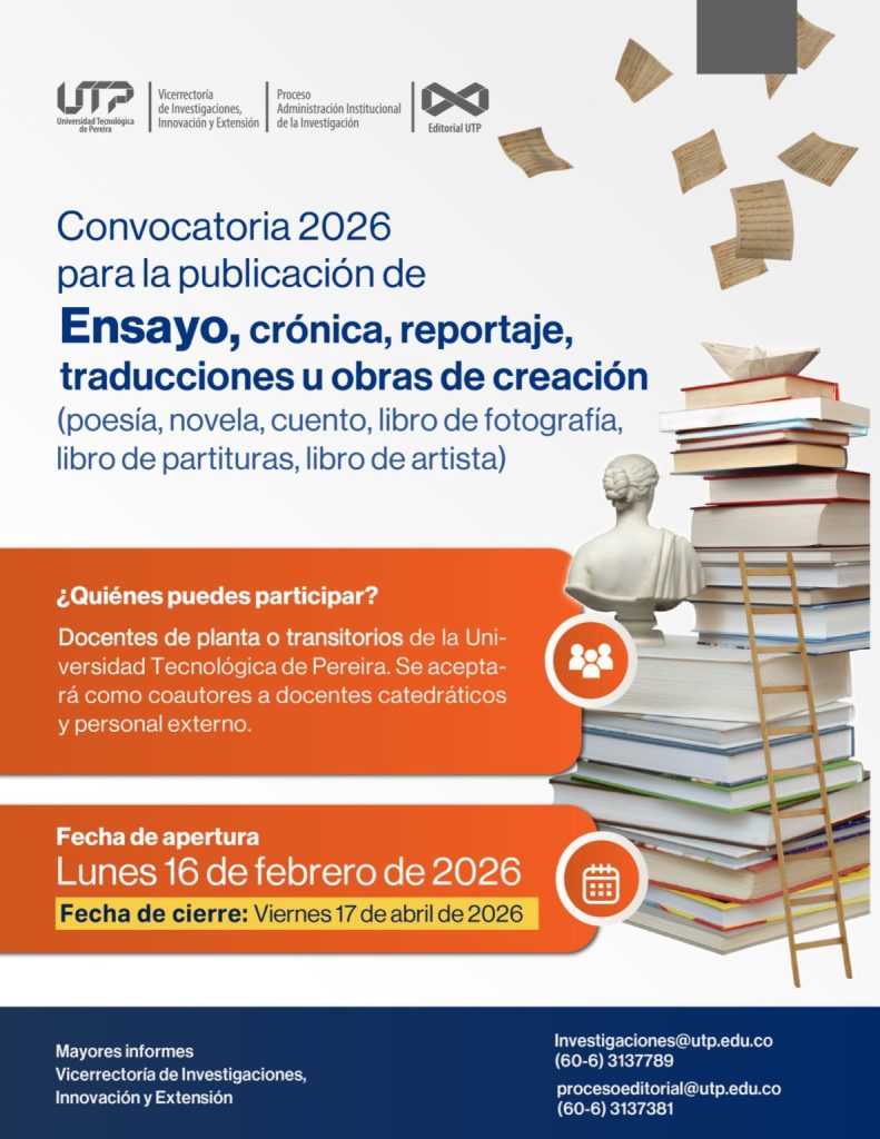 La Universidad Tecnológica de Pereira, a través de la Vicerrectoría de Investigaciones, Innovación y Extensión, la Unidad de Investigaciones y la Editorial UTP, abrió la Convocatoria Interna 2026 para fomentar la publicación de libros de ensayo, crónica, reportaje, traducciones y obras de creación (poesía, novela, cuento, libro de fotografía, libro de partituras, libro de artista), una iniciativa que busca fortalecer la producción académica y creativa de la comunidad universitaria.