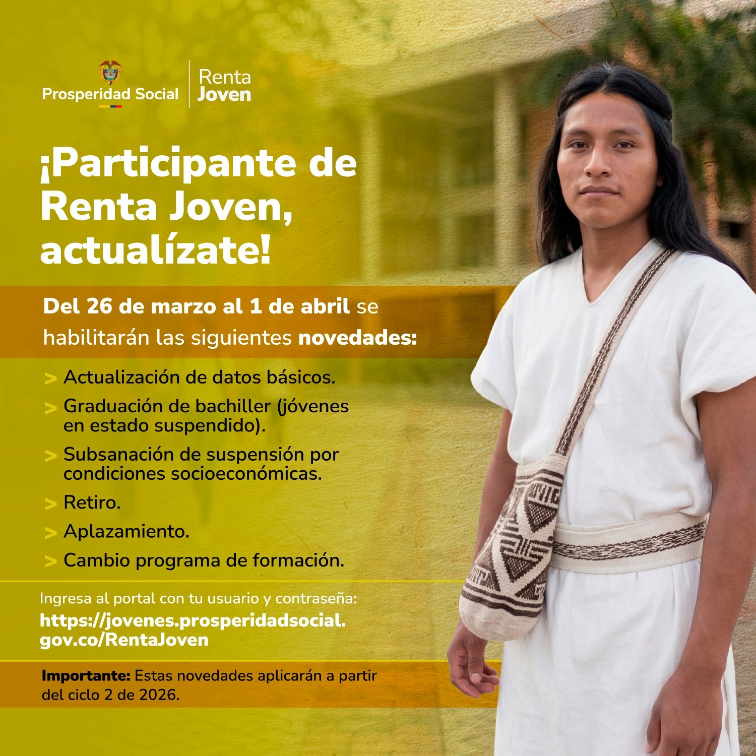 La oficina Renta Joven de la Universidad Tecnológica de Pereira informa que desde el 26 de marzo hasta el 01 de abril del 2026, los jóvenes podrán realizar la creación de las siguientes novedades en el portal de Renta Joven.