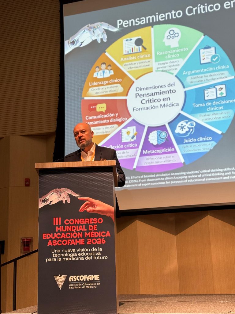 Durante el encuentro, el decano García Castro ofreció una conferencia magistral enfocada en la simulación clínica y las dimensiones del pensamiento crítico. En su intervención, abordó elementos clave como el razonamiento, la argumentación y el juicio clínico, herramientas esenciales para optimizar diagnósticos y terapéuticas que impacten positivamente en la calidad de vida de los pacientes, sus familias y las comunidades.