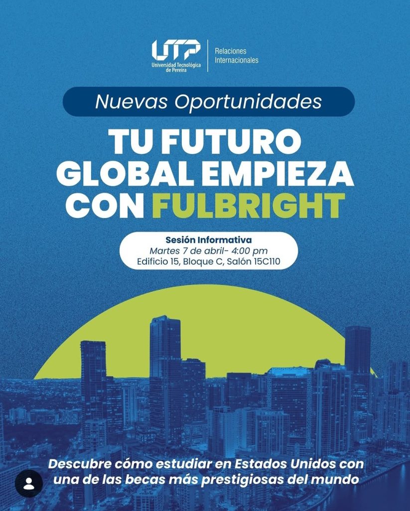 Con el firme propósito de fortalecer la proyección académica y profesional de su comunidad, la Facultad de Ciencias Básicas y la Oficina de Relaciones Internacionales de la Universidad Tecnológica de Pereira (UTP) extienden una invitación formal para participar en la charla sobre oportunidades de estudio en Estados Unidos a través del prestigioso programa Fulbright Colombia.