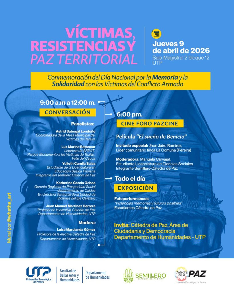 La primera parte de la jornada iniciará a las 9:00 a.m. y se extenderá hasta las 12:00 m. con un espacio de conversación que reunirá a destacadas voces del ámbito institucional, comunitario y académico. Como panelistas participarán Astrid Sabogal Londoño, coordinadora de la Mesa Municipal de Víctimas de Pereira; Luz Marina Betancur, lideresa de AFAVIT; Yulieth Camila Salas, estudiante de Licenciatura en Educación Básica Primaria; Katherine García Ochoa, gerente regional de Prosperidad Social en Caldas y Juan Manuel Martínez Herrera, docente del Departamento de Humanidades. La moderación de este espacio estará a cargo de la profesora Luisa Marulanda Gómez, profesora de la electiva Cátedra de la Paz del Departamento de Humanidades.