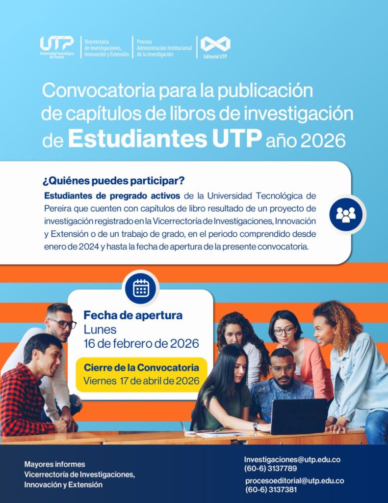 La Universidad Tecnológica de Pereira, a través de la Vicerrectoría de Investigaciones, Innovación y Extensión, invita a los estudiantes de pregrado a participar en la convocatoria 2026 para la publicación de capítulos de libro resultado de investigación, una oportunidad clave para visibilizar el conocimiento generado desde los procesos formativos.