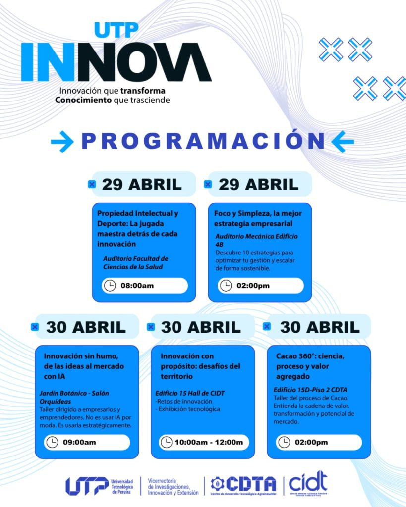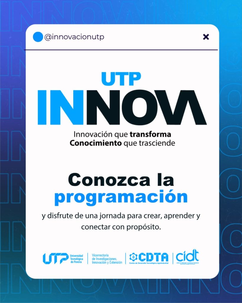 La Universidad Tecnológica de Pereira invita a toda su comunidad universitaria a participar en UTP INNOVA, un evento que, durante dos jornadas, promoverá la cultura de la innovación, el emprendimiento y la propiedad intelectual a través de experiencias prácticas y espacios de aprendizaje.