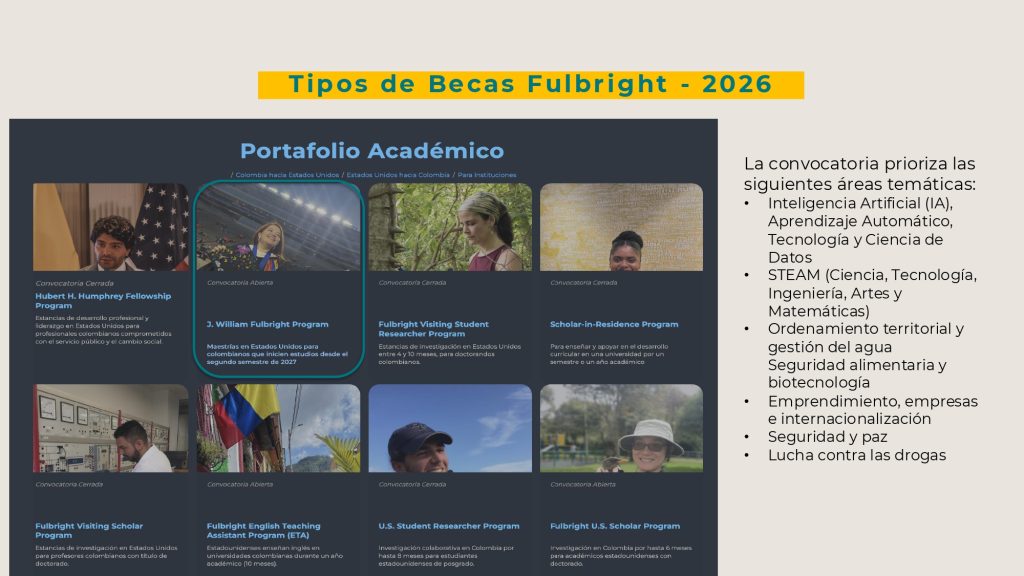 La ponente invitó a los asistentes a no desaprovechar estas oportunidades e iniciar su proceso con tiempo. «Los invito a que revisen la página de Fulbright Colombia; ellos tienen diferentes tipos de becas para distintos perfiles», señaló López, instando a los estudiantes a ser agentes de cambio y a escribir sus propias historias de éxito. Para más información, los interesados pueden consultar el portal oficial de Fulbright Colombia.
