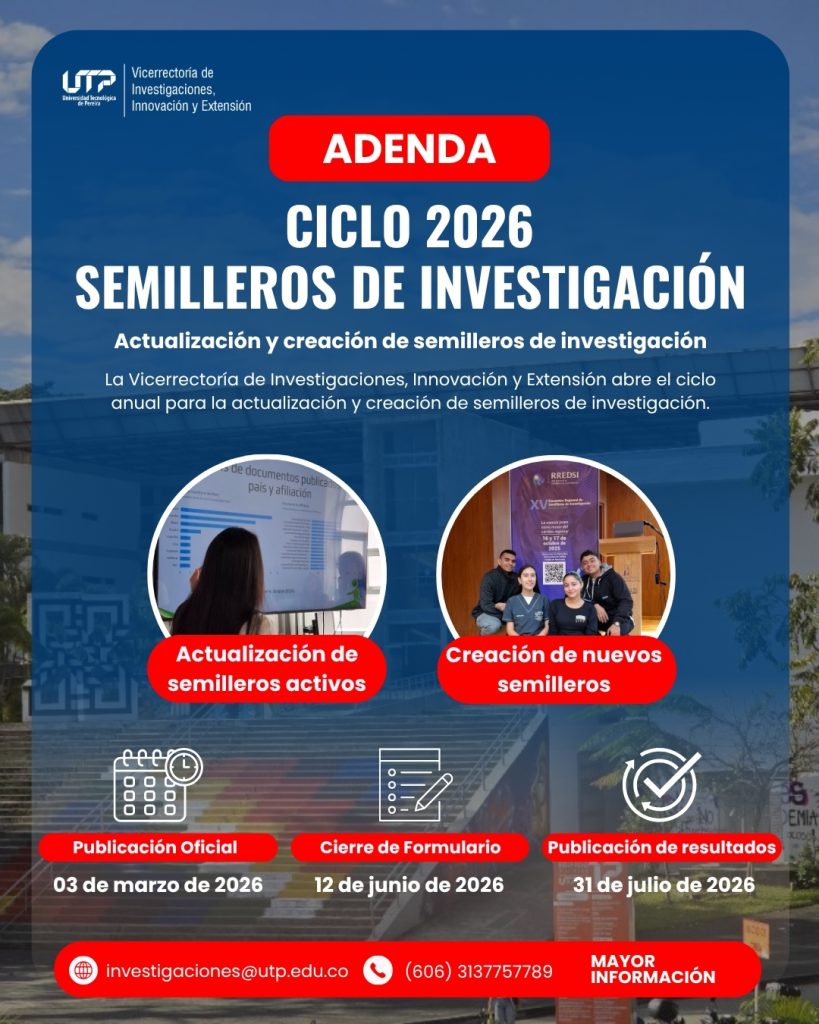 Para ampliar la información y consultar los lineamientos completos, los interesados pueden acceder a https://vicerrectorias.utp.edu.co/viie/ciclo-anual-para-la-actualizacion-y-creacion-de-semilleros-de-investigacion-ano-2026/ o escribir al correo investigaciones@utp.edu.co