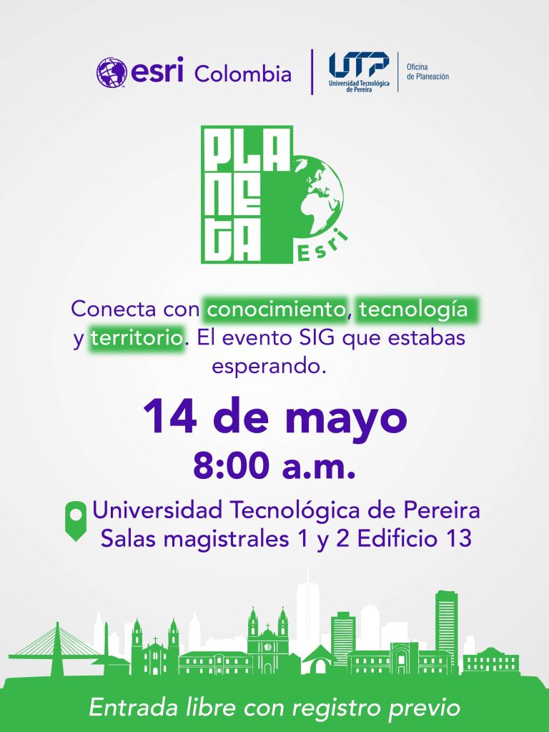 La Universidad Tecnológica de Pereira (UTP) será sede de Planeta Esri, un evento académico y de comunidad dirigido a estudiantes, docentes e investigadores, que busca promover el conocimiento, uso y apropiación de los Sistemas de Información Geográfica (SIG), especialmente a través de la plataforma ArcGIS, conectando conocimiento, tecnología y territorio.