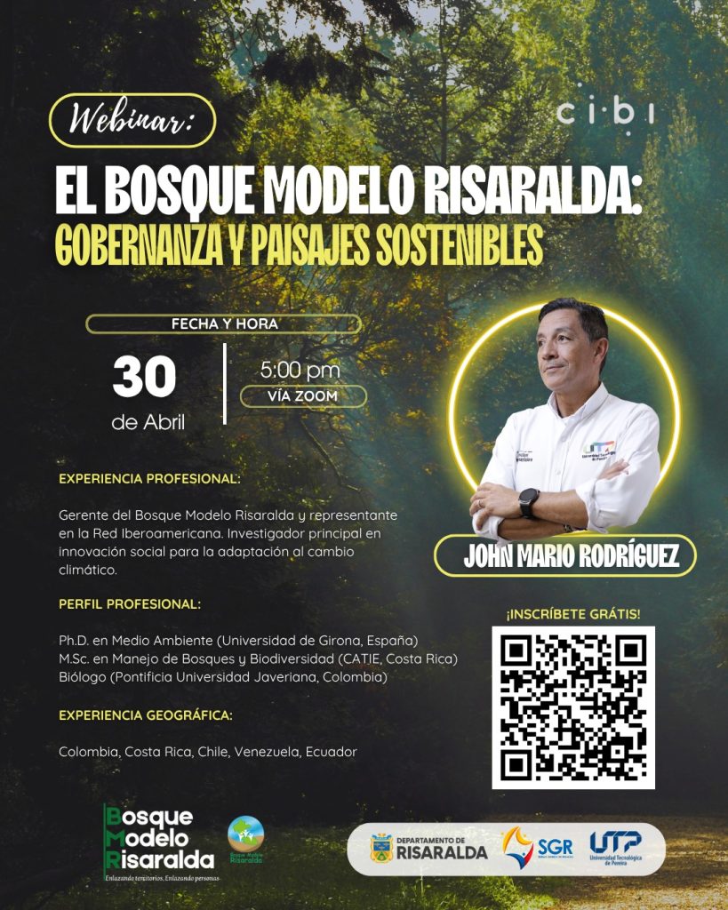 El Centro de Ciencia en Biodiversidad de Risaralda extiende una invitación abierta a la comunidad académica y al público en general para participar en el webinar “El Bosque Modelo Risaralda: Gobernanza y Paisajes Sostenibles”, un encuentro virtual que busca promover el diálogo en torno a la gestión ambiental y el desarrollo sostenible en la región.