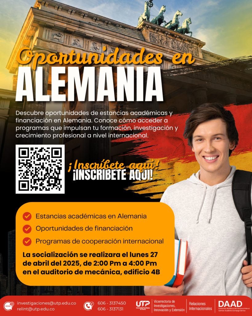 Desde la Vicerrectoría de Investigaciones, Innovación y Extensión (VIIE), en articulación con la Oficina de Relaciones Internacionales (ORI), te invitamos a participar en la socialización de oportunidades académicas en Alemania, en cooperación con el DAAD (Servicio Alemán de Intercambio Académico).