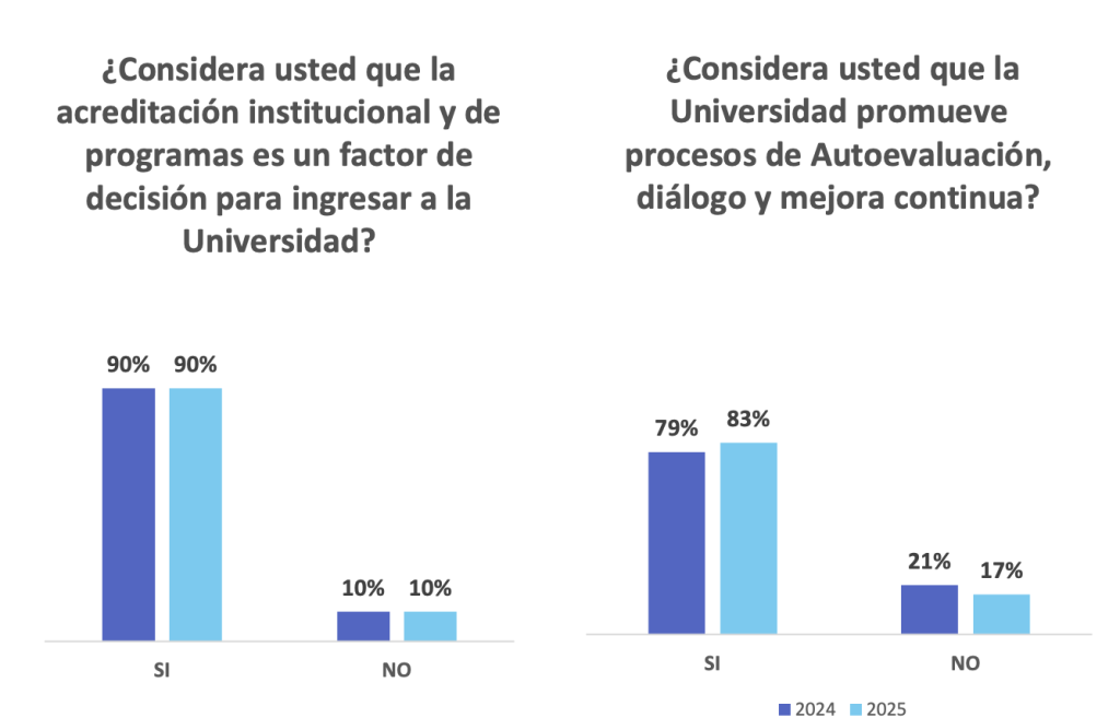 Por otra parte, en el componente de acreditación y autoevaluación institucional, la encuesta permitió identificar la relevancia que estos procesos tienen para la comunidad. El 90 % de los participantes considera que la acreditación institucional y de programas es un factor determinante al momento de elegir la Universidad, lo que resalta su impacto en la confianza y el posicionamiento institucional.
