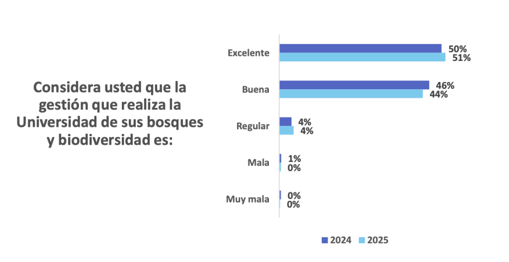 En cuanto a la gestión ambiental, uno de los ejes estratégicos de la universidad, los resultados también fueron destacados. El 92 % de los encuestados calificó como buena o excelente la gestión ambiental del campus, mientras que el 95 % valoró positivamente las acciones relacionadas con la conservación de los bosques y la biodiversidad, lo que evidencia el compromiso institucional con la sostenibilidad y la protección del entorno natural.