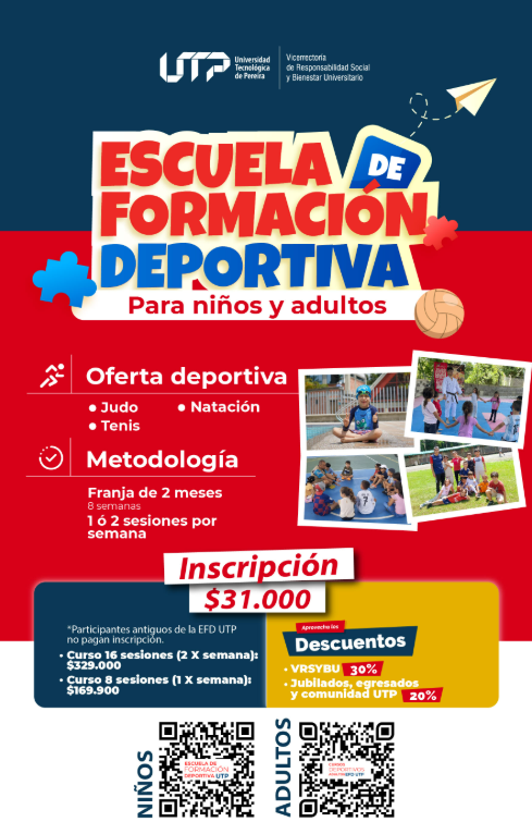 La Universidad Tecnológica de Pereira, a través de la Vicerrectoría de Responsabilidad Social y Bienestar Universitario, invita a la comunidad universitaria y a sus familias a participar en la Franja II de la Escuela de Formación Deportiva UTP, una iniciativa orientada a promover hábitos de vida saludable, el desarrollo físico y la integración a través del deporte.
