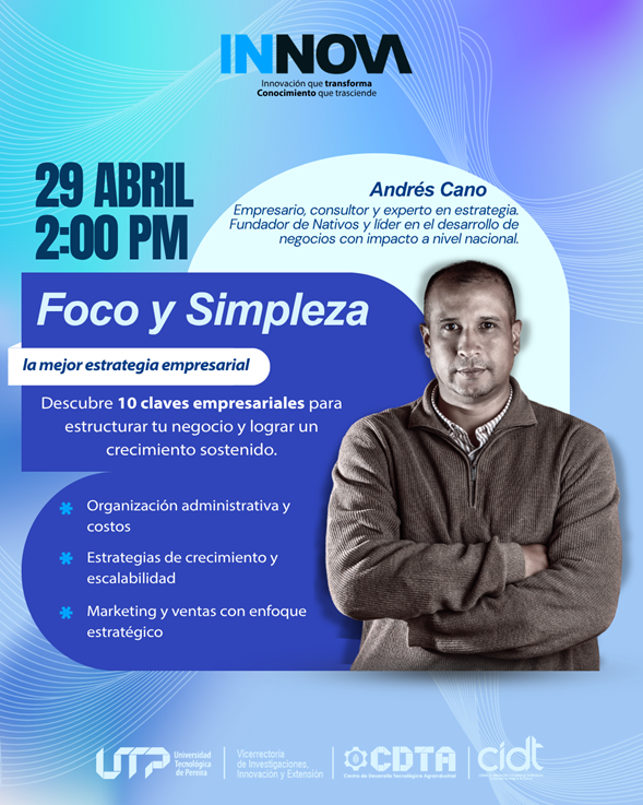La sesión contará con la participación de Andrés Cano, economista, magíster en economía y experto en estrategia empresarial, con una destacada trayectoria en el sector público y privado. Ha liderado procesos de competitividad a nivel regional, dirigido empresas en distintos sectores y es fundador de Nativos, una marca con presencia en más de 65 ciudades del país. Además, ha acompañado el desarrollo de más de 100 emprendimientos, aportando una visión práctica y aplicada del crecimiento empresarial.