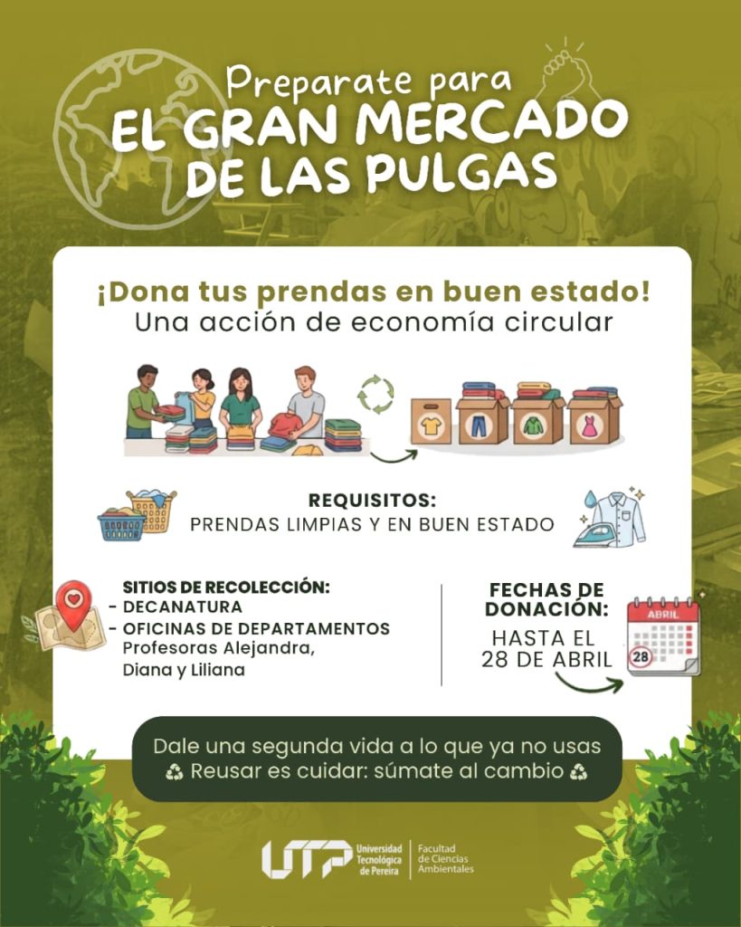 En el marco de las conmemoraciones por el Día de la Tierra y el Día del Árbol, la Facultad de Ciencias Ambientales de la Universidad Tecnológica de Pereira (UTP) ha lanzado una invitación abierta a la comunidad para participar en el «Gran Mercado de las Pulgas». Esta iniciativa busca fomentar prácticas de economía circular y sostenibilidad dentro del campus universitario.