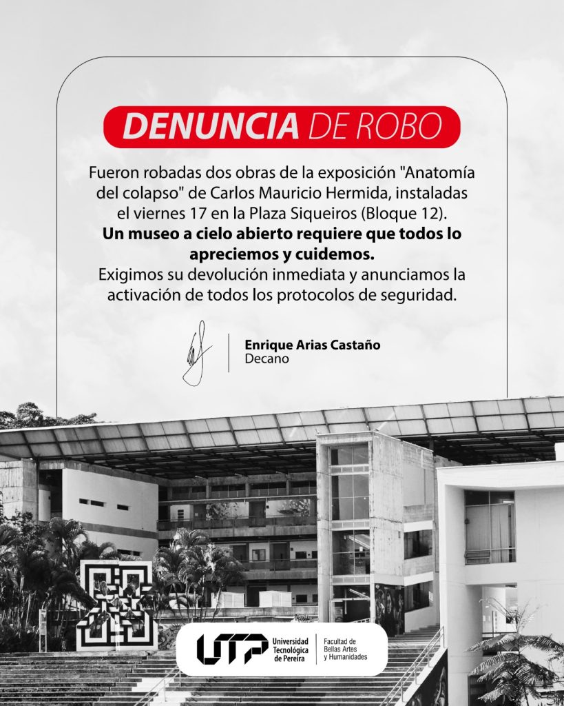 La Facultad de Bellas Artes y Humanidades hizo pública una denuncia formal tras el hurto de dos piezas artísticas que formaban parte de la exposición «Anatomía del colapso», del autor Carlos Mauricio Hermida. El incidente, que vulnera el patrimonio cultural de la comunidad, ocurrió en las instalaciones de la Plaza Siqueiros (Bloque 12).