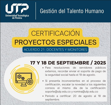 El proceso de Administración de la Compensación recuerda que los días miércoles 17 y jueves 18 de septiembre del 2025, son las fechas asignadas para realizar la Certificación y Aprobación de docentes, administrativos y monitores de Proyectos Especiales (Acuerdo 21) – Periodo a certificar desde el 20 de agosto hasta el 18 de septiembre del 2025 según su correcta ejecución.