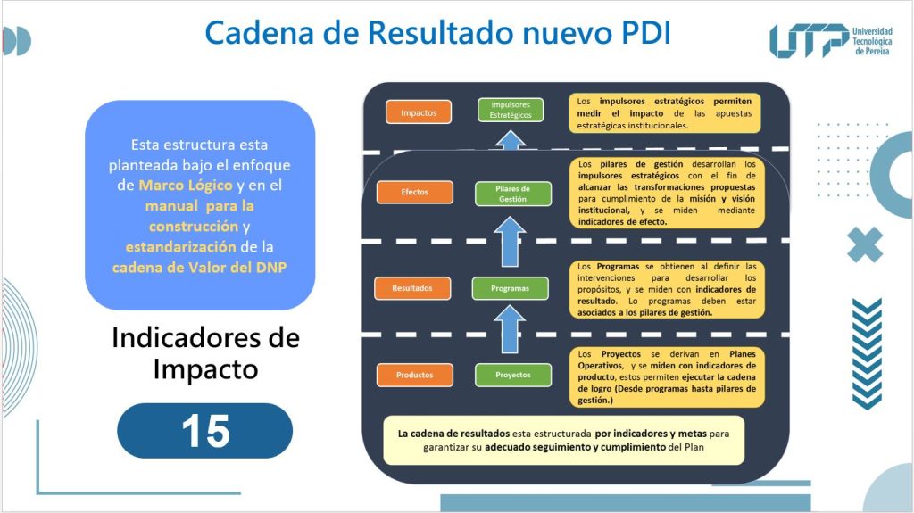 De allí la importancia de que, en el ejercicio de fortalecimiento del PDI 2025-2028, realizado en el primer semestre del año y aprobado el 2 de julio de 2025, la UTP definió la incorporación de 15 indicadores de impacto con los impulsores estratégicos, una herramienta que no solo mide el avance en la ejecución, sino que también permite evaluar los cambios reales y sostenibles que las acciones emprendidas generan en la comunidad universitaria y en el entorno social. Y adicionalmente, con esto se da respuesta al plan de mejoramiento del proceso de acreditación internacional y se va fortaleciendo el modelo de acreditación institucional.
