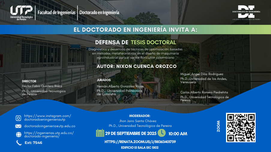 La Universidad Tecnológica de Pereira, a través de su Doctorado en Ingeniería, invita a la comunidad académica y científica a la defensa de tesis doctoral del investigador Nixon Cuenca Orozco, quien presentará un trabajo orientado al fortalecimiento del sector floricultor colombiano mediante el uso de inteligencia artificial.