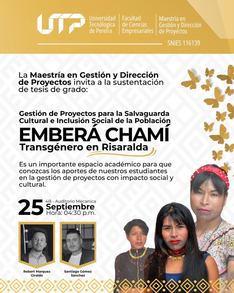 La Maestría en Gestión y Dirección de Proyectos invita a la sustentación del trabajo de grado titulado “Gestión de Proyectos para la Salvaguarda Cultural e Inclusión Social de la Población Emberá Chamí Transgénero en Risaralda”