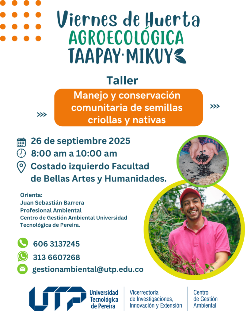 El próximo viernes 26 de septiembre de 2025, de 8:00 a.m. a 10:00 a.m., se realizará el taller “Manejo y conservación comunitaria de semillas criollas y nativas”, una actividad que busca fortalecer el conocimiento agroecológico y la soberanía alimentaria desde el trabajo colectivo. El encuentro será guiado por Juan Sebastián Barrera Montealegre, profesional ambiental que ha acompañado este proceso desde sus inicios.