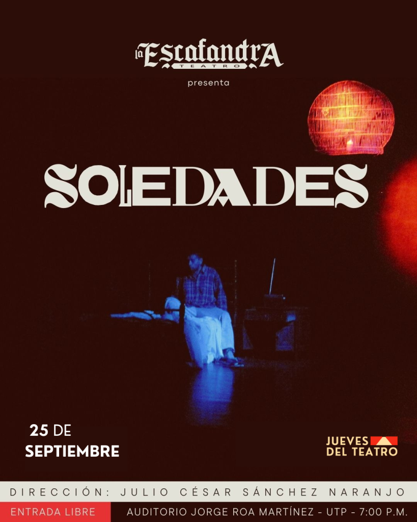 En el marco de los Jueves del Teatro, espacio cultural permanente apoyado por la Vicerrectoría de Responsabilidad Social y Bienestar Universitario, este jueves 25 de septiembre se presentará la obra Soledades, del grupo La Escafandra Teatro. La función será a las 7:00 p.m. en el Auditorio Jorge Roa Martínez. La entrada es libre, con cupo limitado.